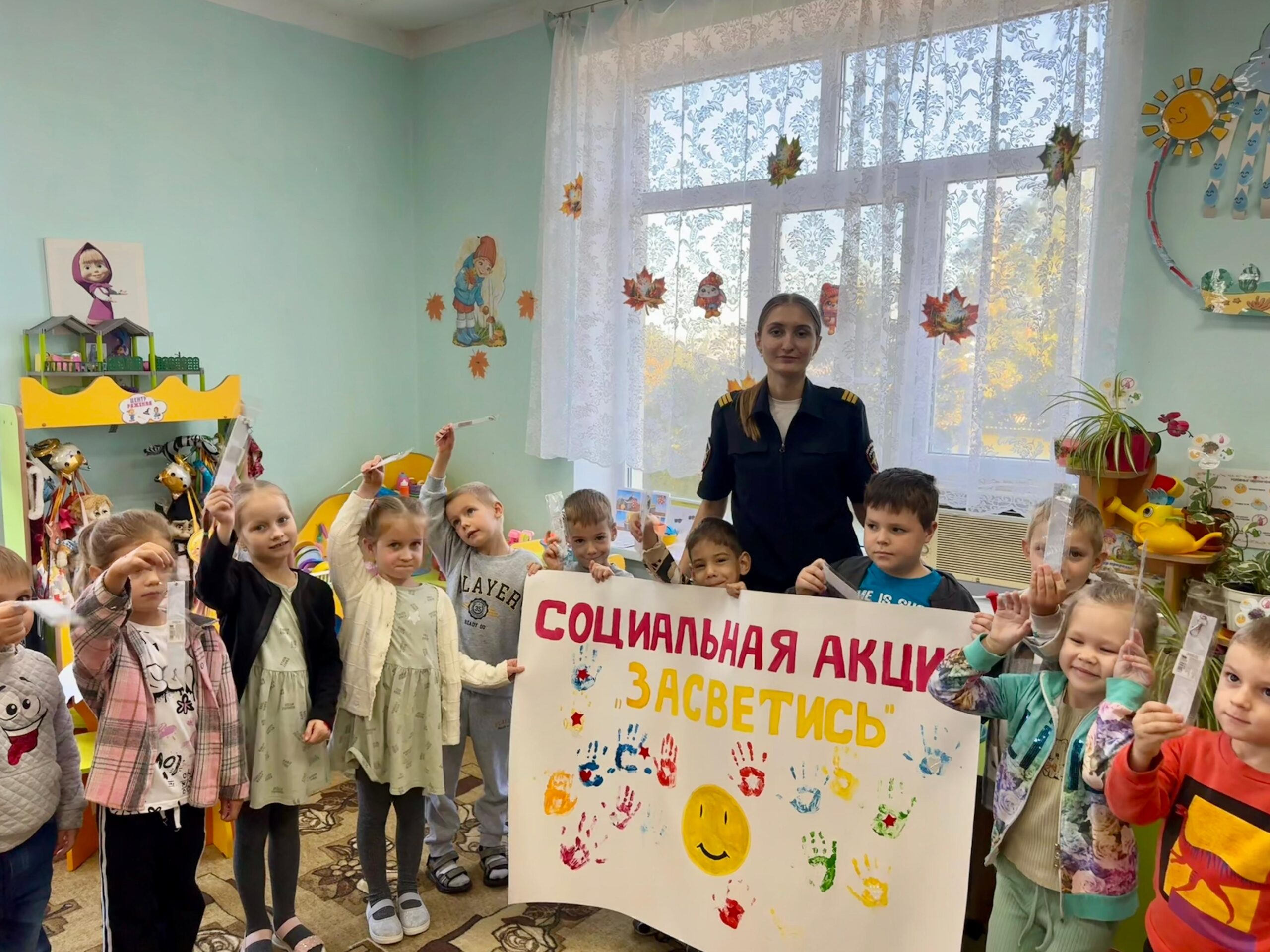 Кульминацией акции стало создание общего плаката «Засветись». Малыши оставляли отпечатки своих ладоней на большом листе бумаги, создавая гуашью красочный и запоминающийся рисунок, который символизирует единство и заботу о безопасности.