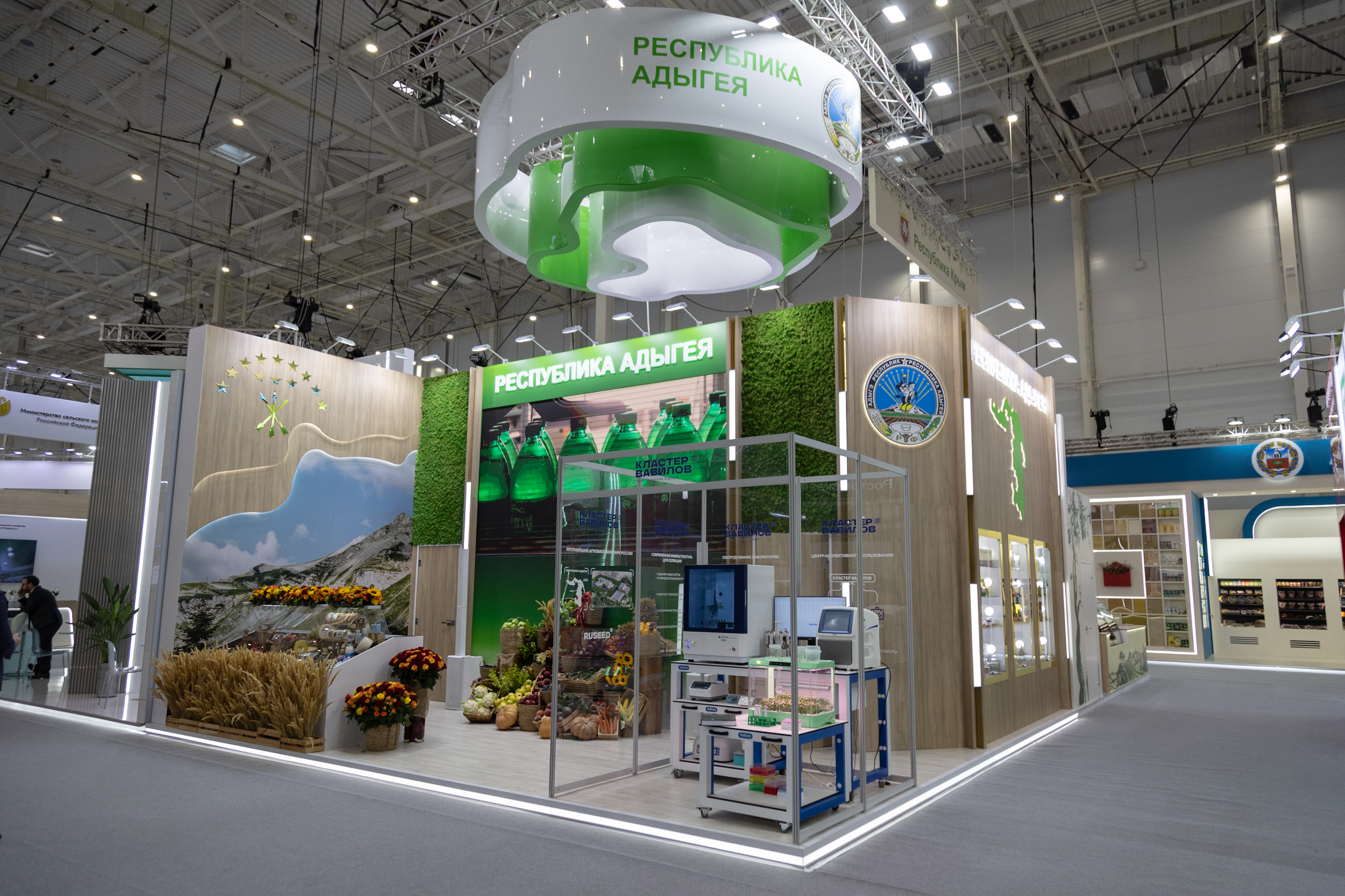 На площадке республики также представлен прототип лаборатории агробиотехнопарка «Кластер Вавилов» – мощного инновационного центра в сфере агробиотехнологий, который компания «Русид» создает в Гиагинском районе. Он исполнен в виде стеклянного куба площадью 4 кв. метра, внутри которого находится стол с лабораторным оборудованием.