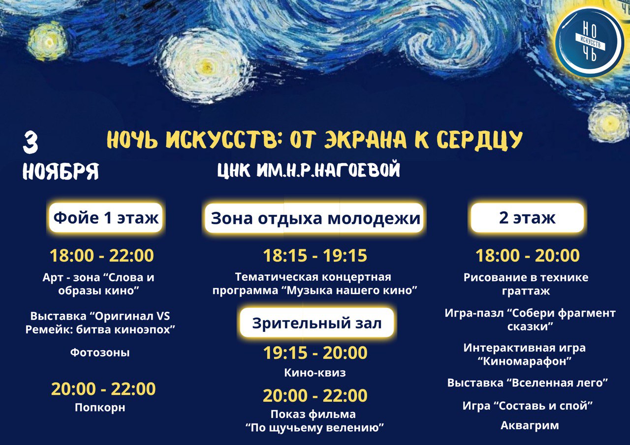 3 ноября в Центре народной культуры имени Н.Р. Нагоевой пройдёт Ночь искусств — 2025. В этом году девиз мероприятия: «Ночь искусств: от экрана к сердцу».