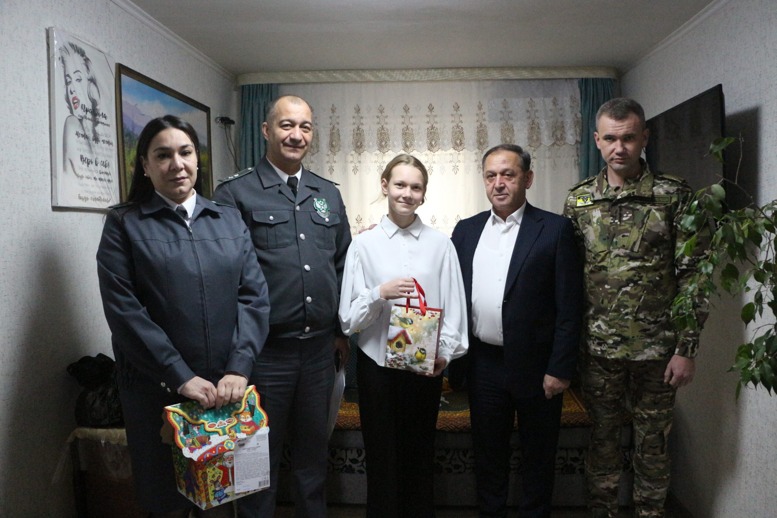 Поздравить девочку и вручить подарки приехали представители Южного межрегионального управления Россельхознадзора: главные государственные инспекторы Рустам Гучетль и Асланбек Тешев, старший госинспектор земельного надзора Рузана Хуако, госинспектор государственного отдела Антон Кочергин. В недавнем прошлом Антон был участником специальной военной операции и защищал интересы Родины. Сейчас он стоит на страже выполнения российского законодательства в области фитосанитарного контроля и ветеринарного надзора.