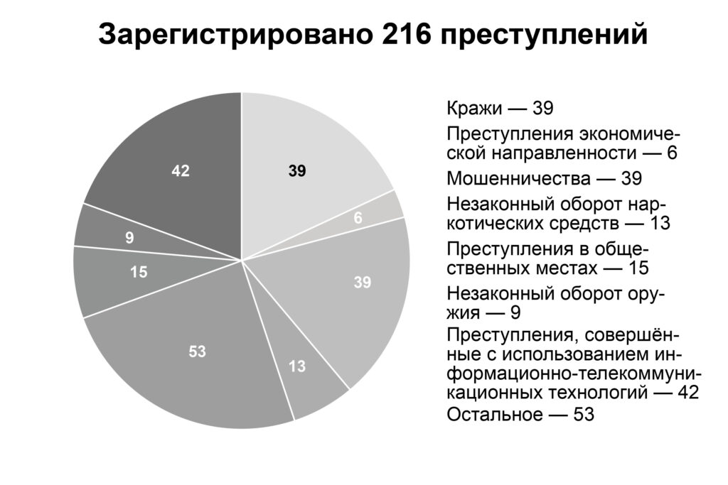 За 12 месяцев 2025 года в ОМВД России по Гиагинскому району зарегистрировано 216 преступлений. На графике выделены преступления, имеющие наибольшее влияние на криминогенную ситуацию на территории района.